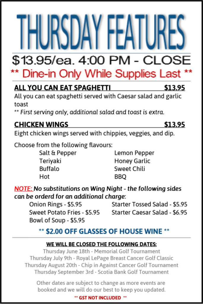 Our Clubhouse is now closed for the Season. We would like to thank everyone for their continued patronage. See you in the Spring!